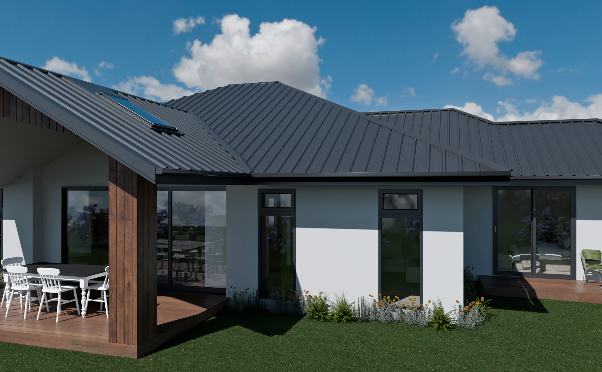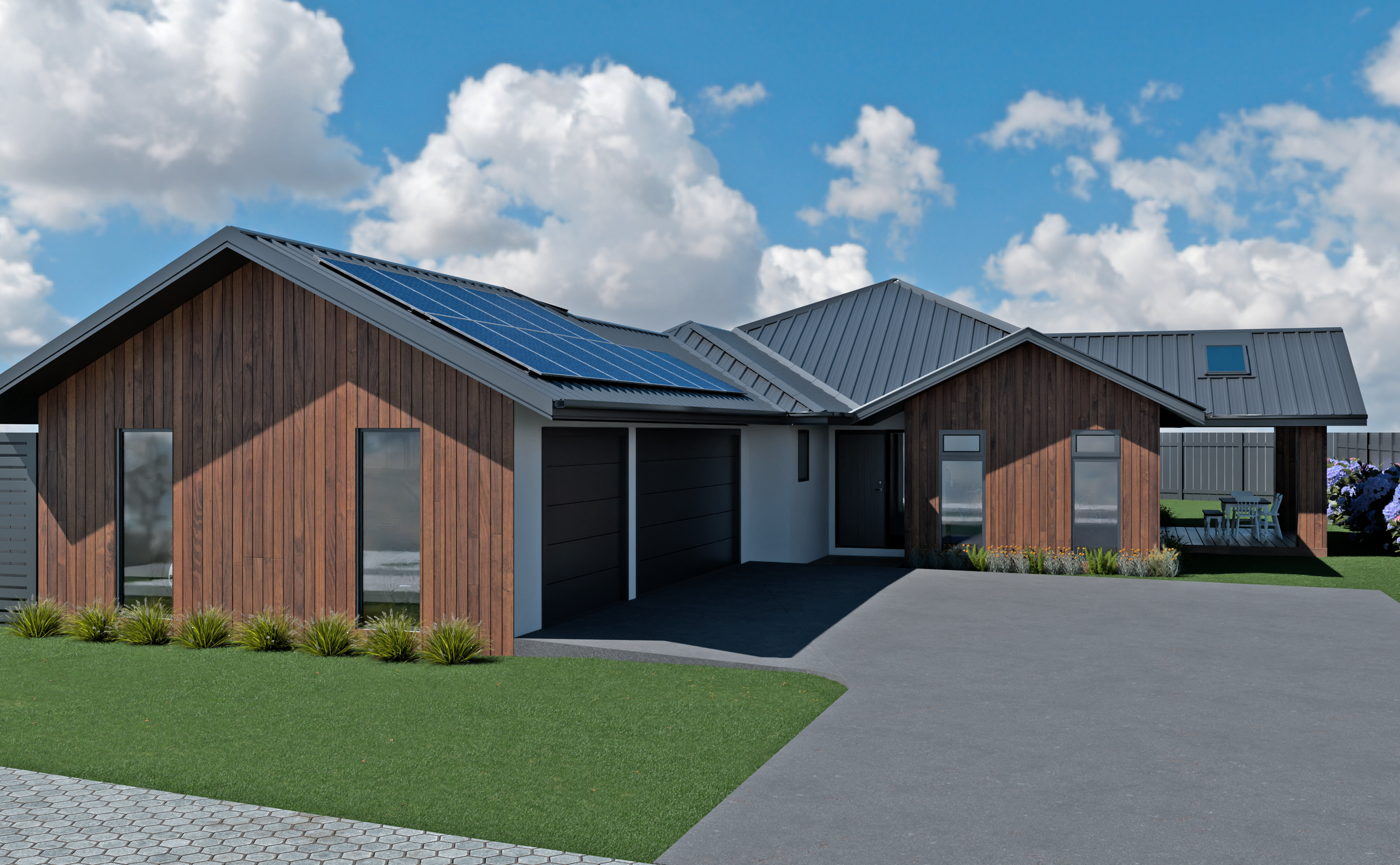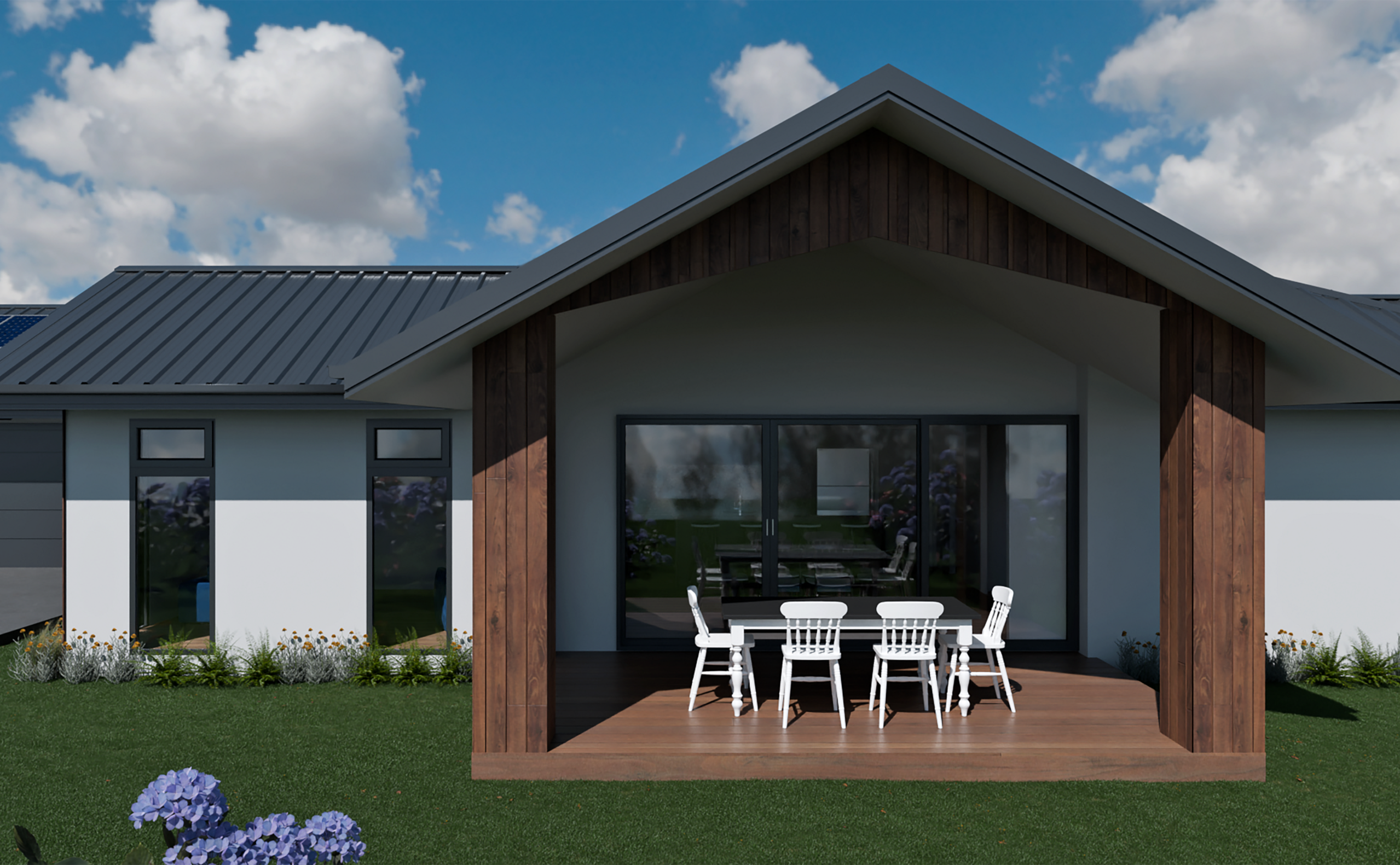 Cedar cladding decorates the exterior of this home, bringing a warm and natural finish that complements the modern style of the build. The Kwila deck is turned into an elegant feature with cedar-clad pillars and a gabled roof with scissor trusses; Velux skylights in the roof ensure that the space stays bright while still providing shelter from the elements. With sliding doors leading out from the living area of the home, this space makes for ideal outdoor dining and hosting in the summer.