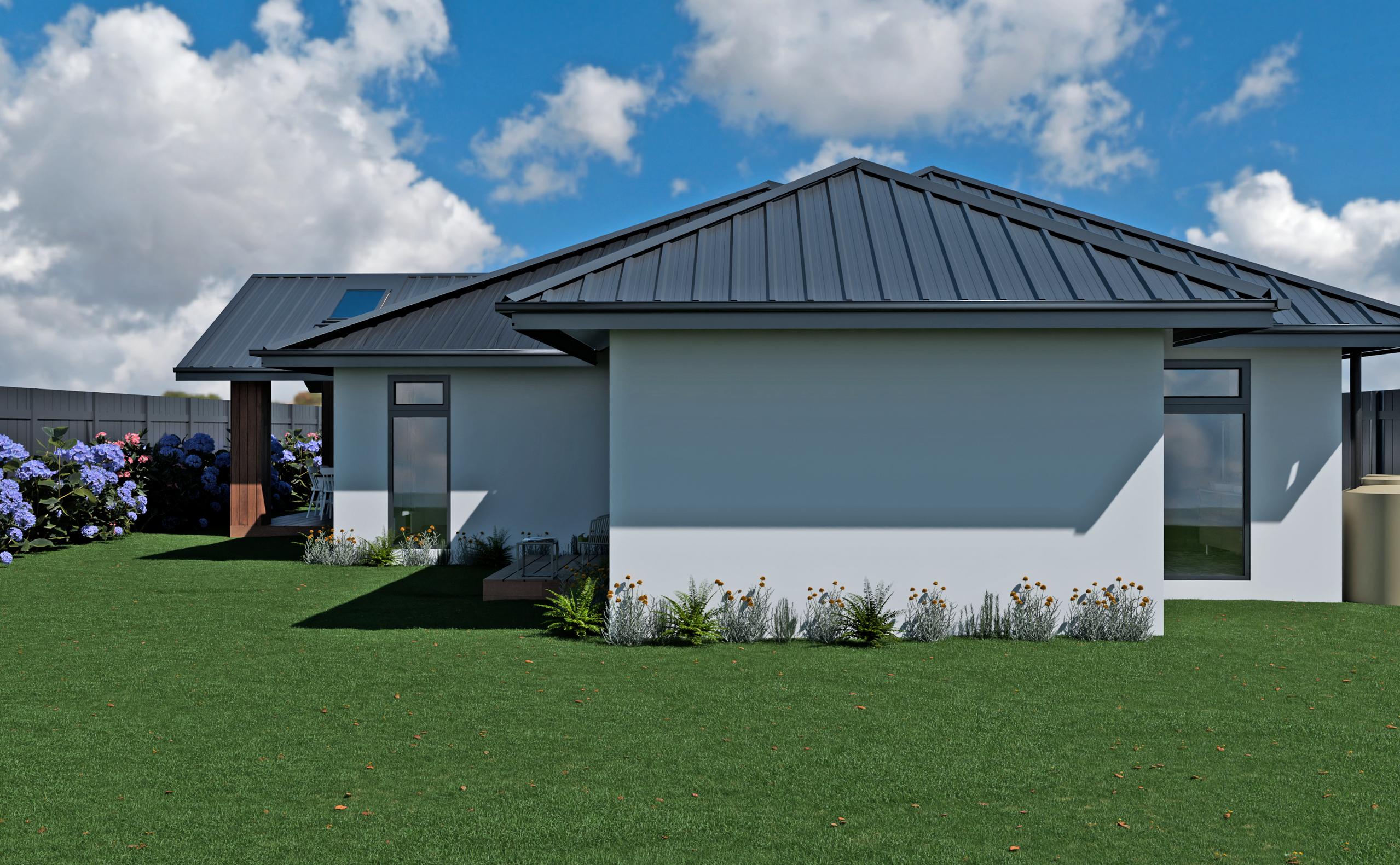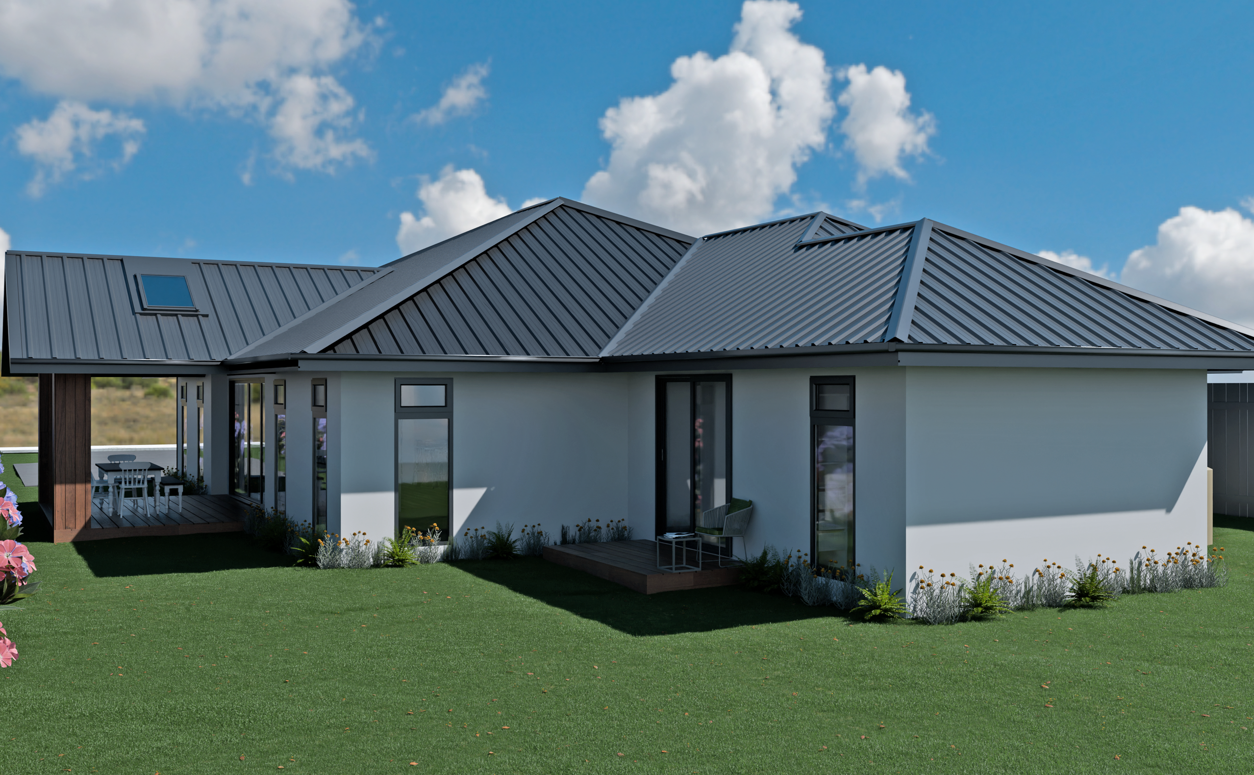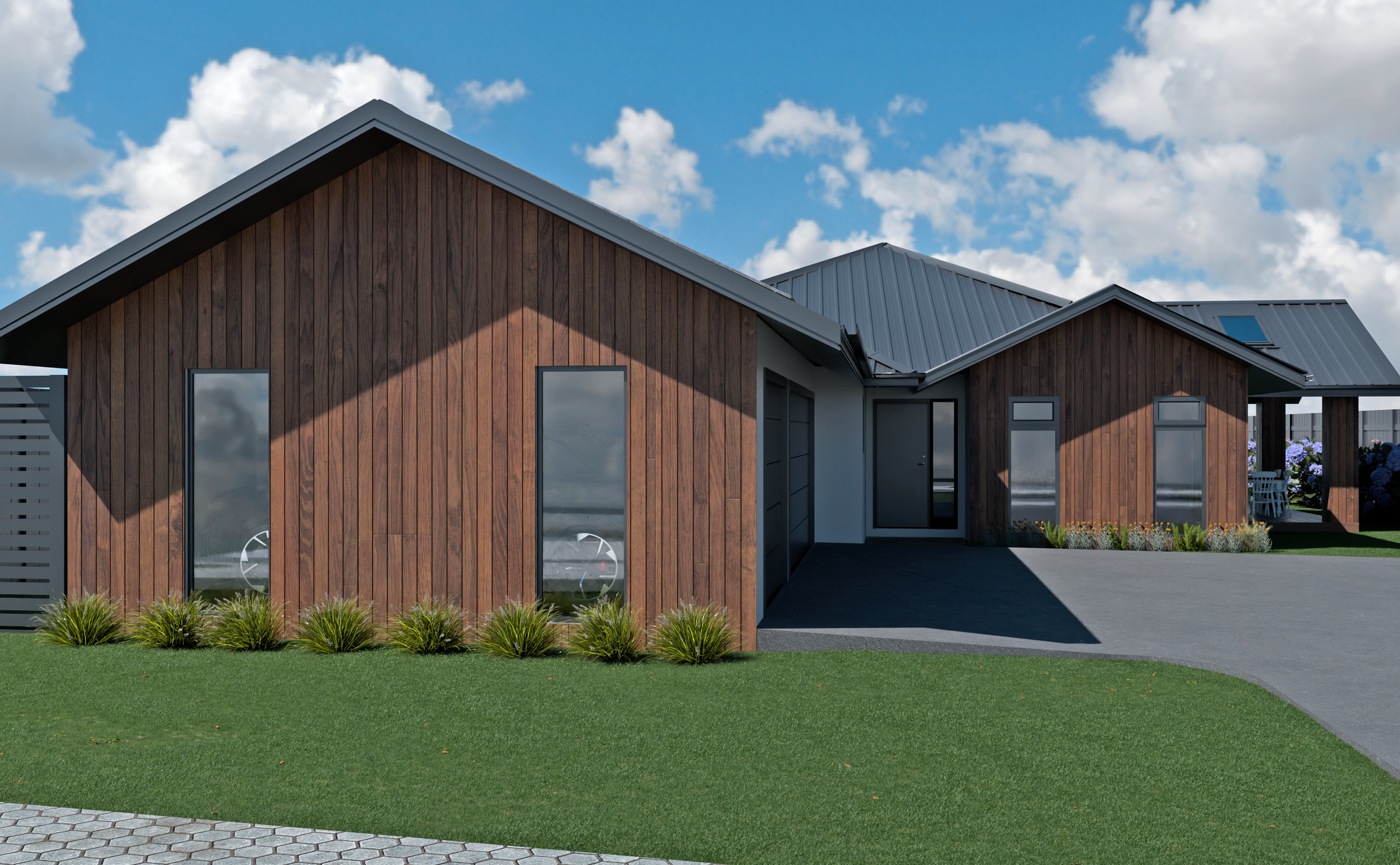 Cedar cladding decorates the exterior of this home, bringing a warm and natural finish that complements the modern style of the build. The Kwila deck is turned into an elegant feature with cedar-clad pillars and a gabled roof with scissor trusses; Velux skylights in the roof ensure that the space stays bright while still providing shelter from the elements. With sliding doors leading out from the living area of the home, this space makes for ideal outdoor dining and hosting in the summer.