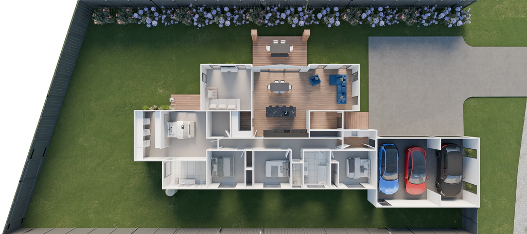 The interior is equally well-designed. The open plan living area boasts soft oak laminate flooring and large windows to make the space light and airy. The scissor trusses of the alfresco are continued through the ceiling of the dining and kitchen, creating a standout feature in the living room and connecting it to the outdoor dining space. The kitchen is fitted with modern furnishings, and a walk-in pantry gives you ample storage. A second lounge gives you plenty of space to relax after a long day.